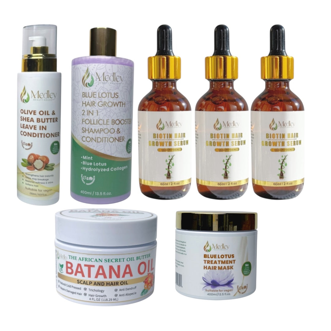 Kickstart your journey to healthier, stronger, and longer hair with the Medley Mega Starter Combo Set! This all-in-one growth-boosting, scalp-nourishing, and hair-repairing set is designed to revitalize your hair from root to tip using the power of nature’s finest ingredients.