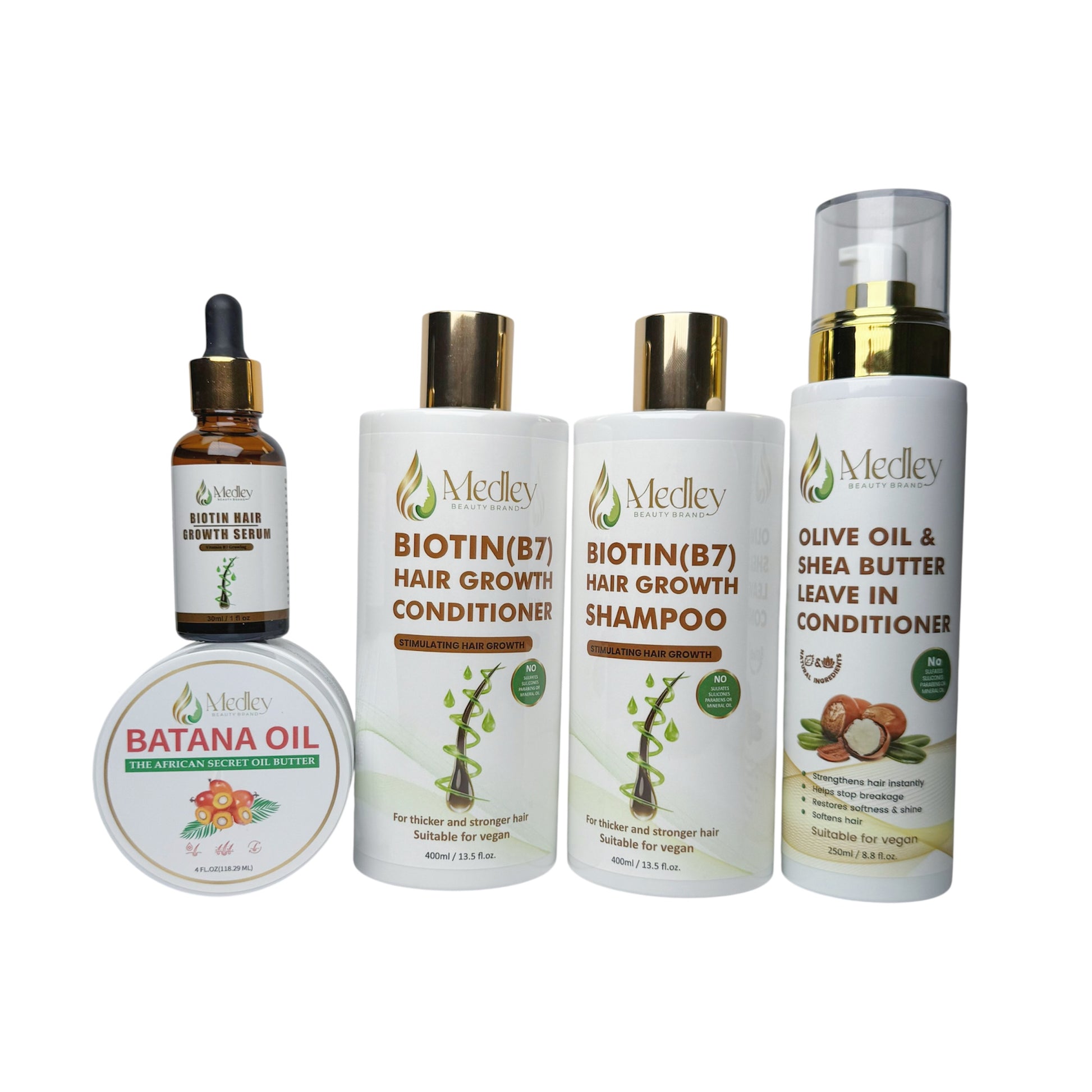 Get stronger, fuller, and healthier hair with the Medley Thicker Hair Bundle. Infused with Biotin (B7), Batana Oil, and Olive Oil & Shea Butter, this complete hair care set promotes rapid hair growth, reduces breakage, hydrates deeply, and restores natural volume and shine.
